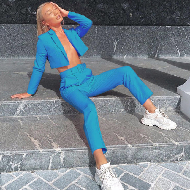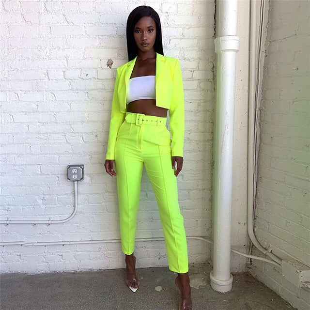 Chicology crop blazer top belt high waist pant 2019 summer sexy 2 piece co ord set office women suit neon lady business clothing