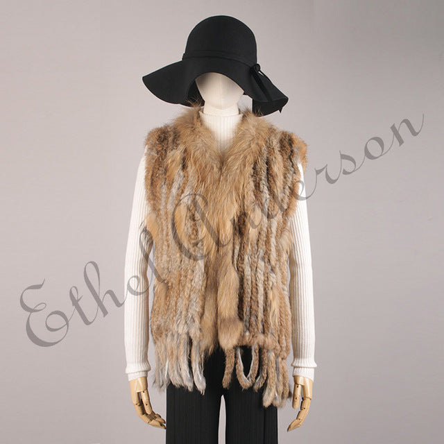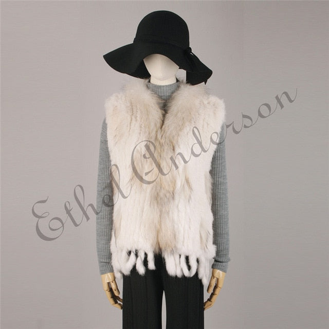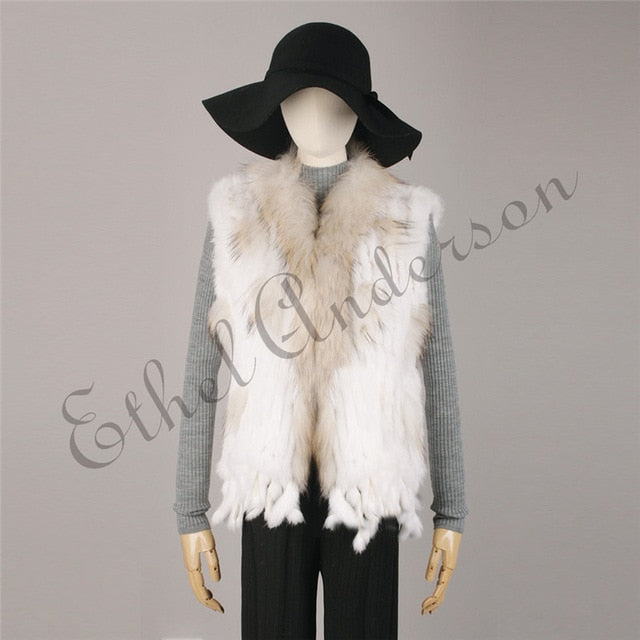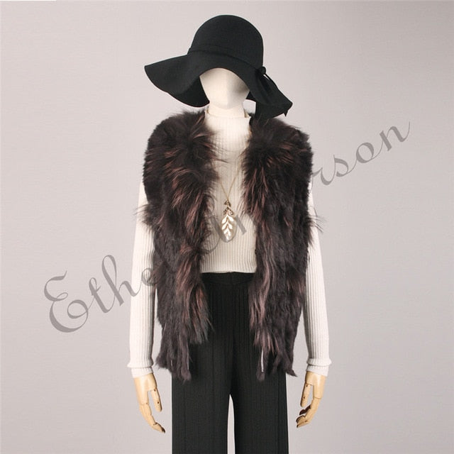 Natural Rabbit Fur Vest With Raccoon Fur Collar Party Waistcoat jackets knitted Gilets women wool vest colete de pele de coelho