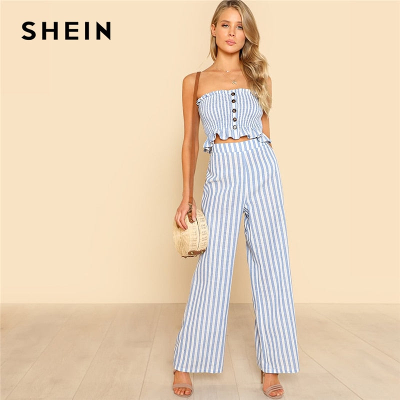SHEIN Blue Bohemian Shirred Ruffle Hem Strapless Crop Cami Top and Wide Leg Pants Striped Sets Women Summer Beach Two Piece Set